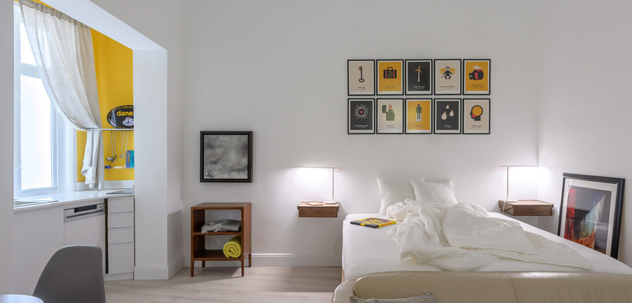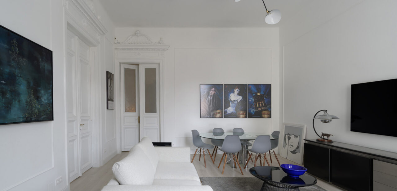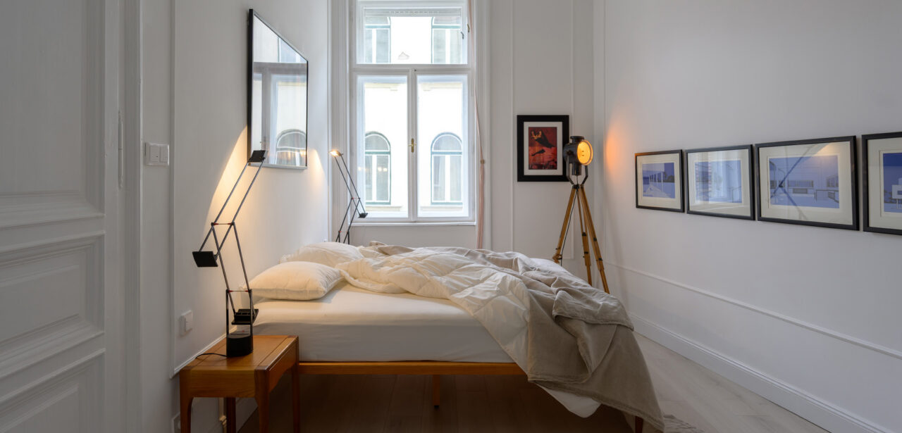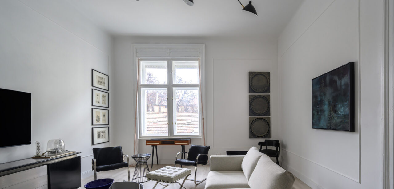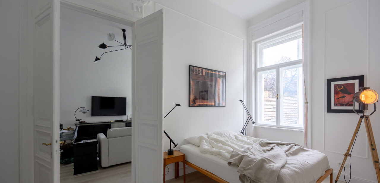 The apartment is in a four-storey building with internal courtyard in the heart of Budapest’s Palace Quarter in District VIII. The original apartment was split into a one-bedroom pied-a-terre with a self-contained studio for guests. The original Art Nouveau doors and frames were kept, but most of the original decoration had been lost. Minimal wall mouldings were added to provide scale to the high-ceilinged rooms and contain the client’s artworks. The floors were a light oak timber with white walls and Mouille lighting.